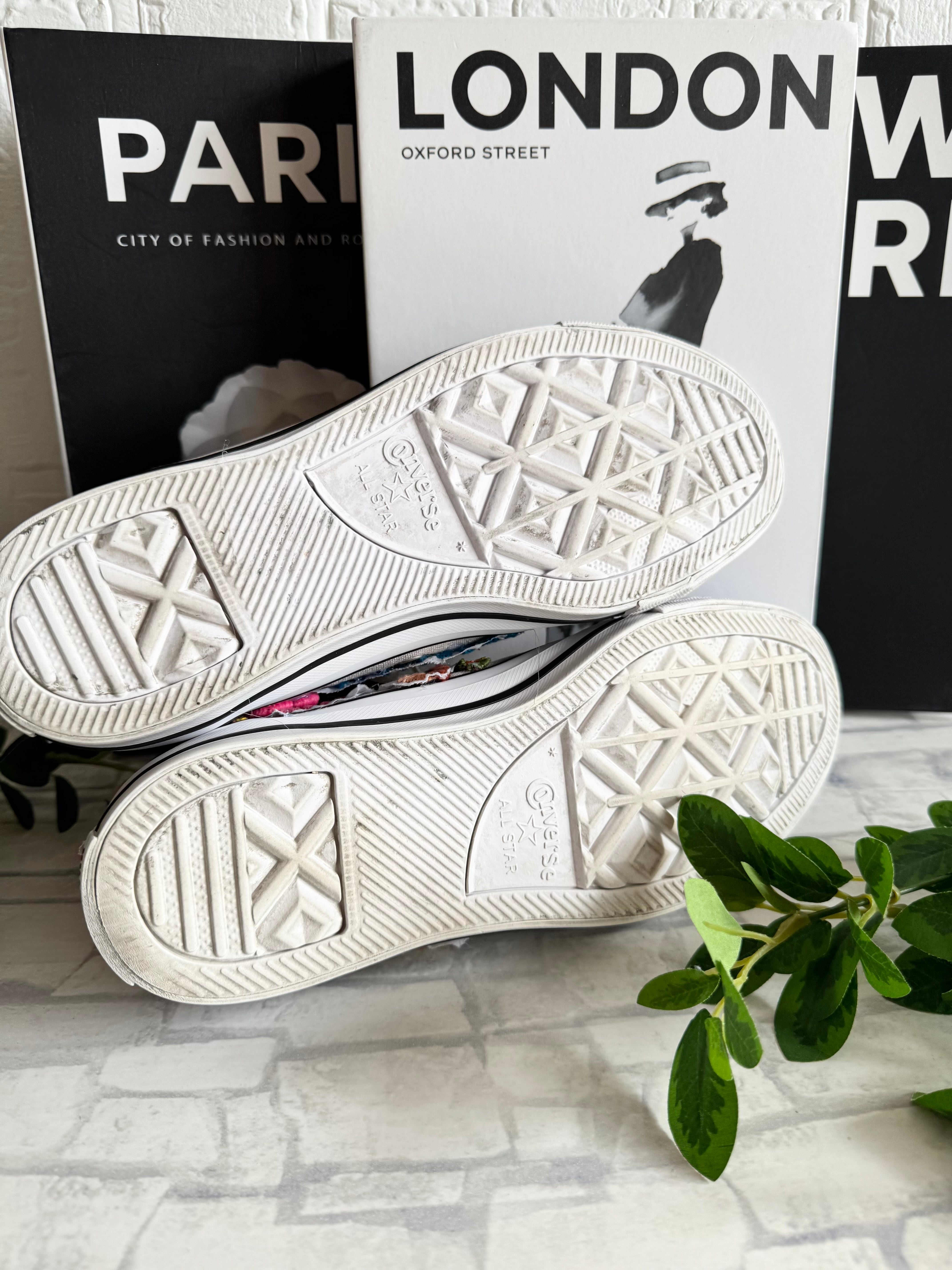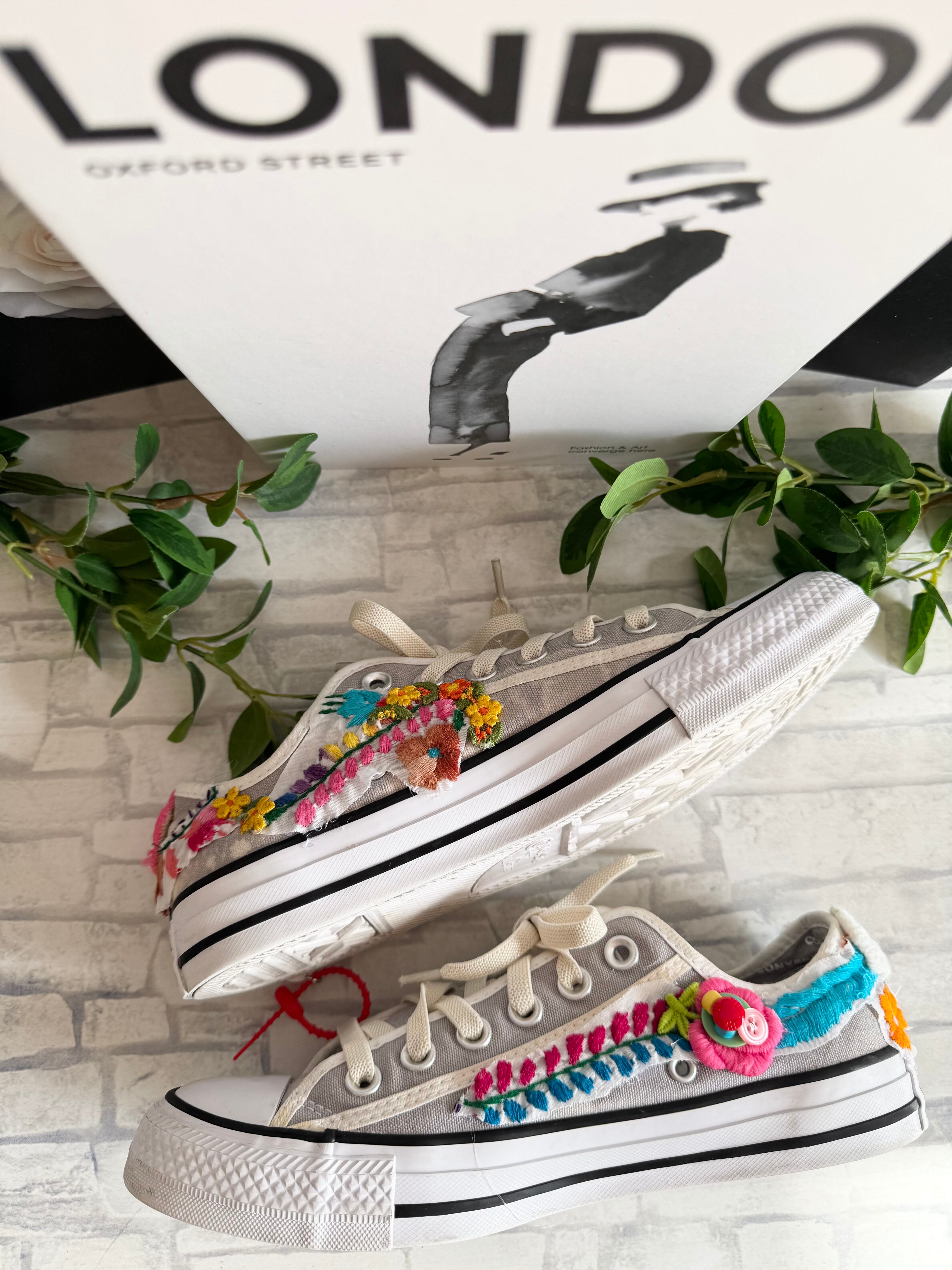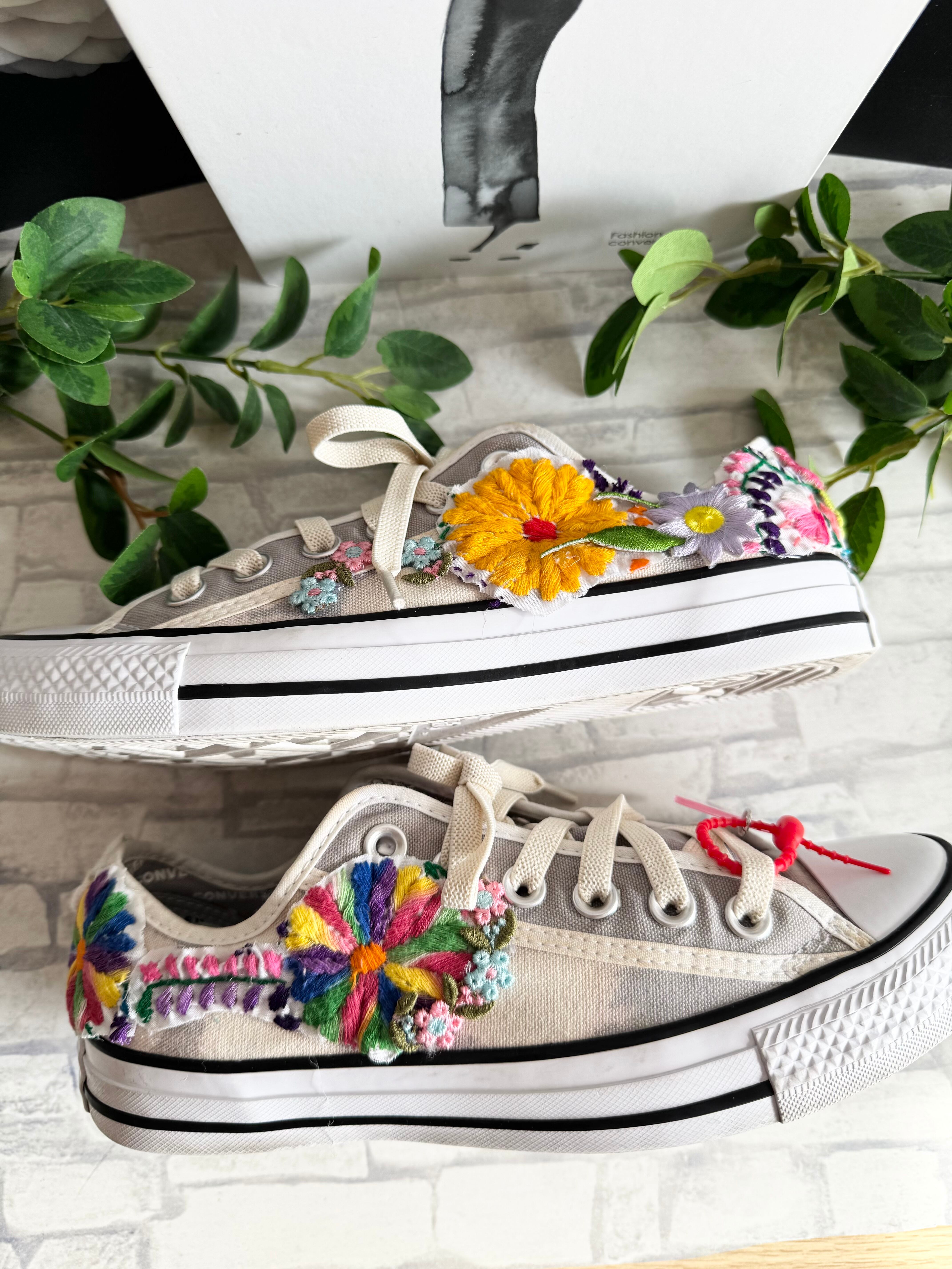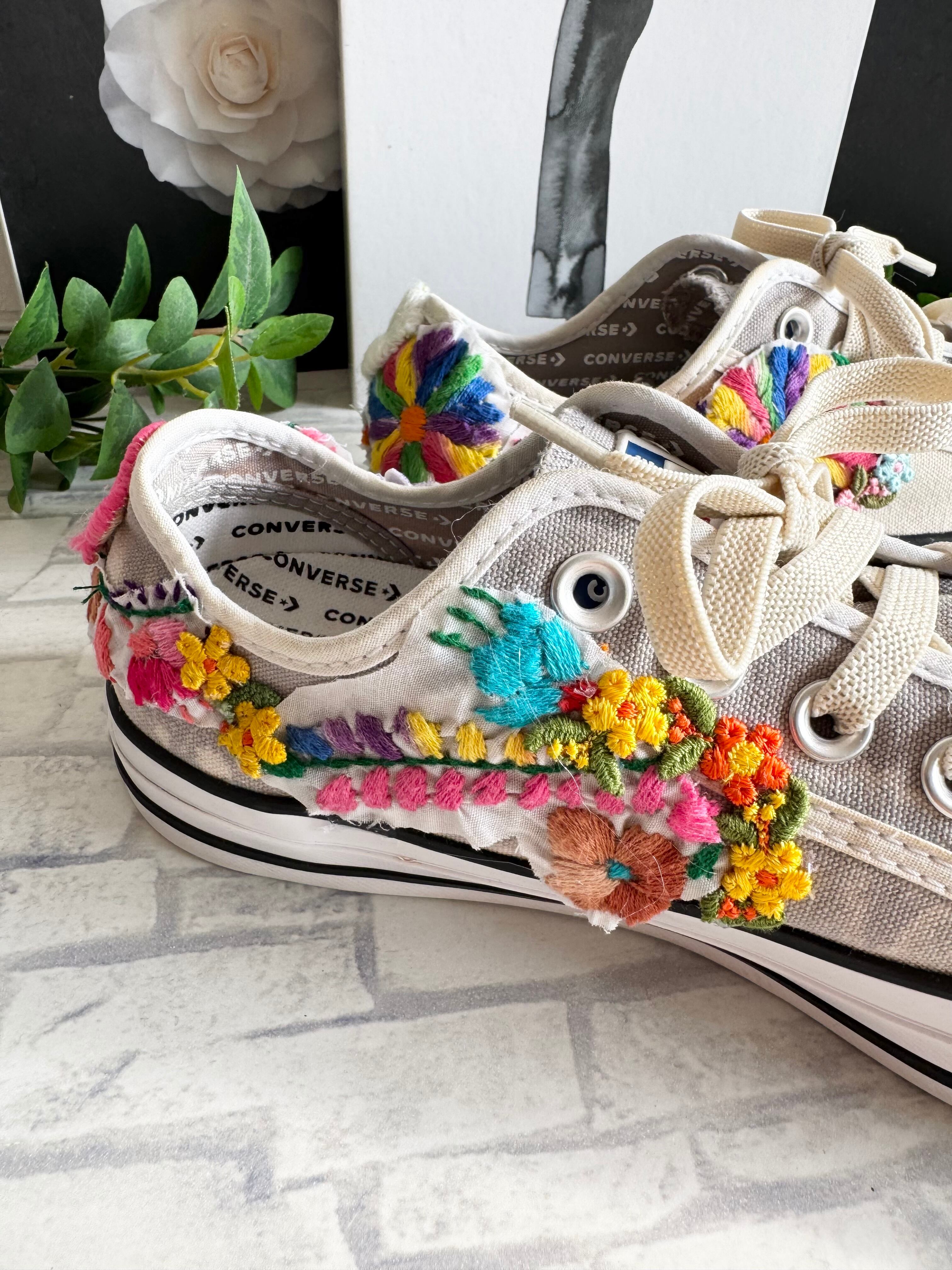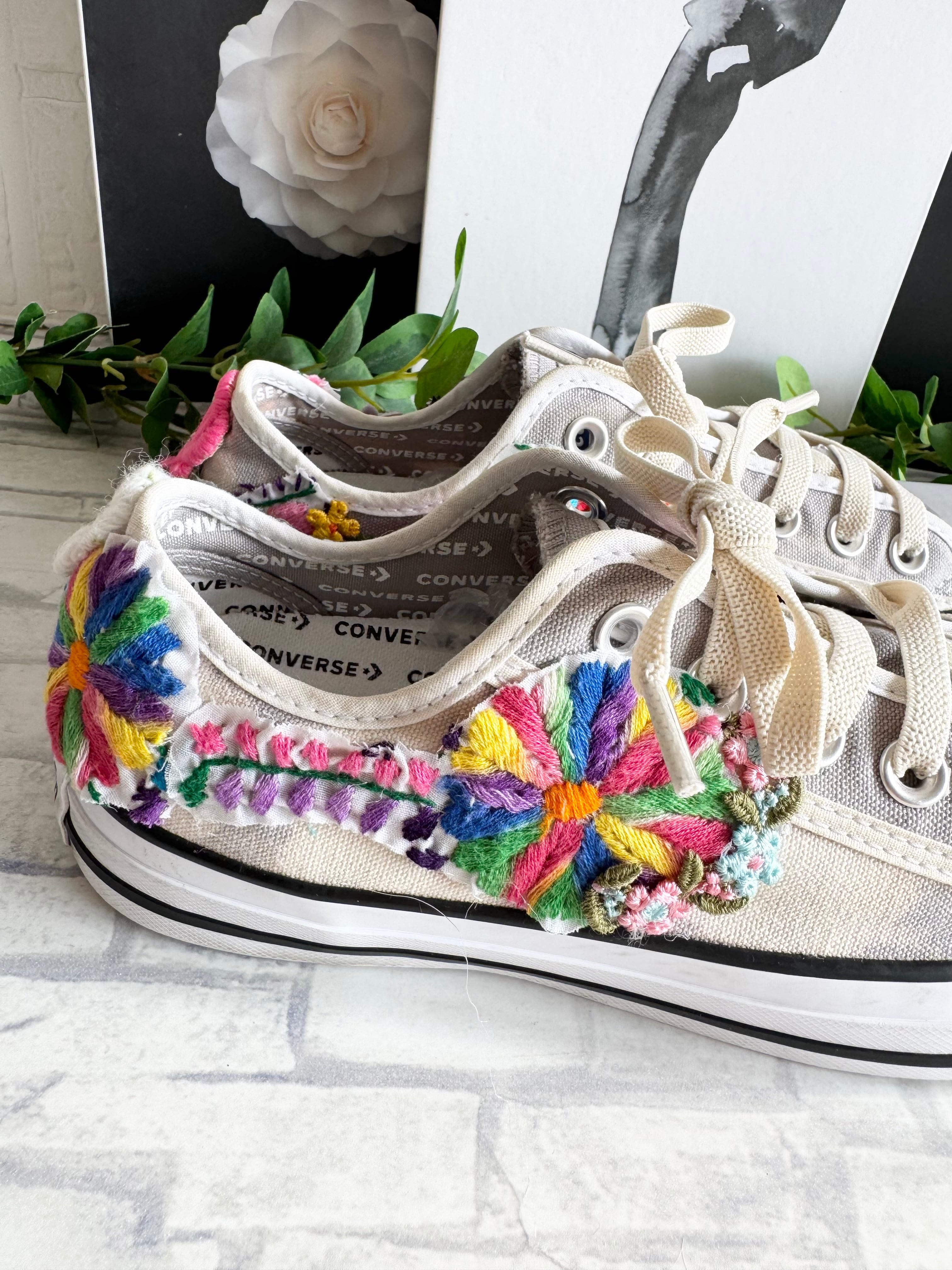 Usedのコンバース(クリーニング済)に、ヴィンテージのメキシカンドレス刺繍やワッペンを組み合わせてデザインした 一点物のハンドメイドスニーカー です。