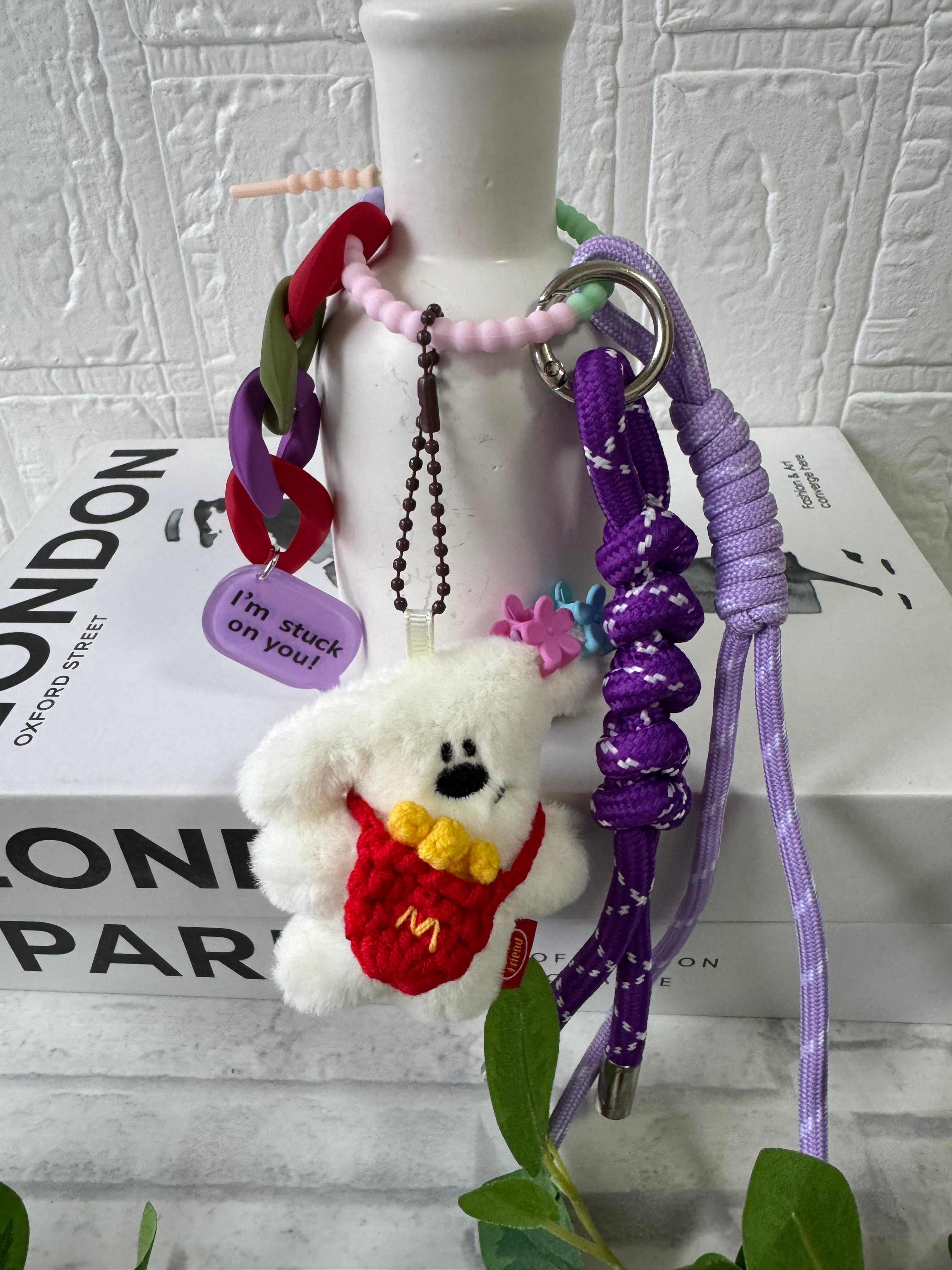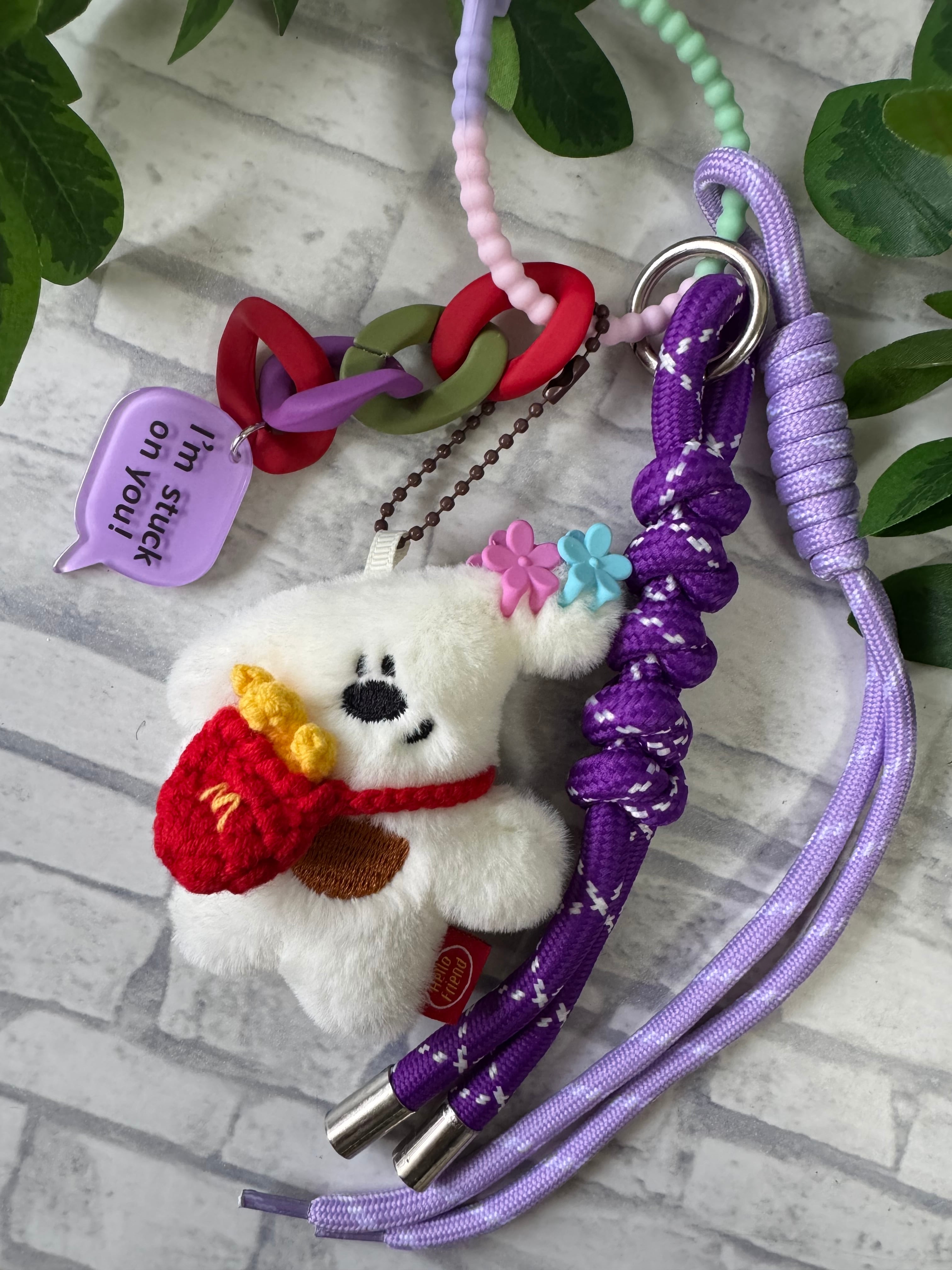 もこもこボディに、カラフルなロープを組み合わせた、遊び心たっぷりの一点物です。